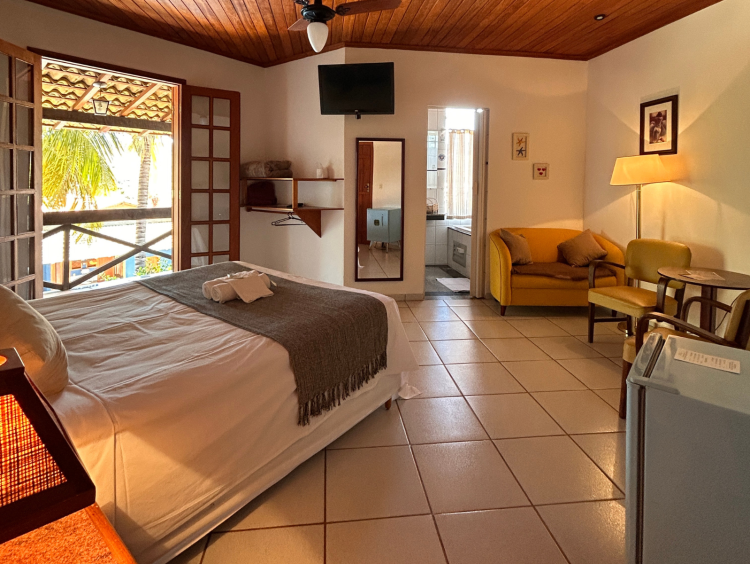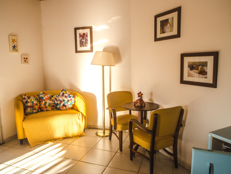A suíte apresenta um charmoso sofá amarelo vibrante, com mantas e almofadas confortáveis, criando um ambiente acolhedor e convidativo. Ideal para relaxar após um dia explorando a Serra do Cipó.