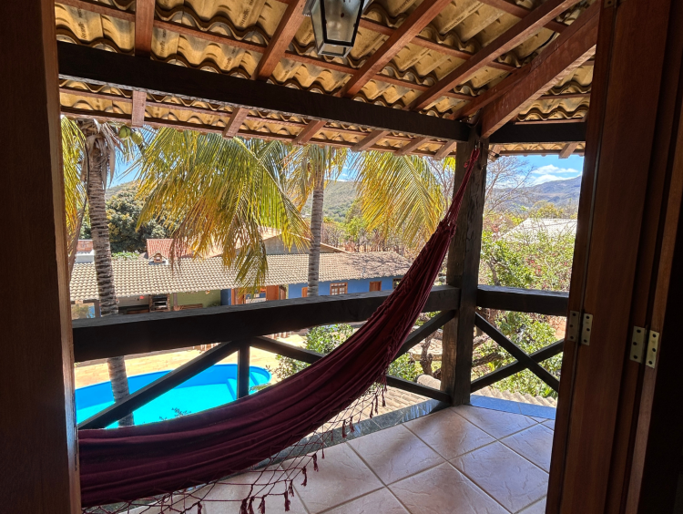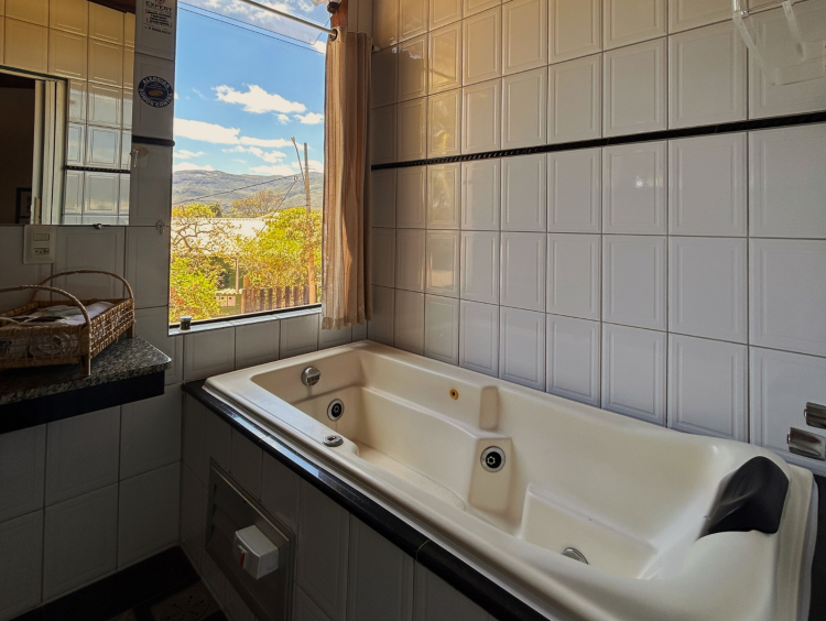 Linda e confortável suíte com banheira de hidromassagem para uma pessoa, se encontra no segundo andar da pousada, possui cama box, tv de LED, ventilador de teto, varanda exclusiva com rede, frigobar e banheiro privativo. Sacada com vista para jardins e piscina. Linda vista da banheira para as montanhas. Para hospedagem de apenas uma pessoa, sugerimos entrar em contato conosco. Não hospedamos crianças nesta acomodação