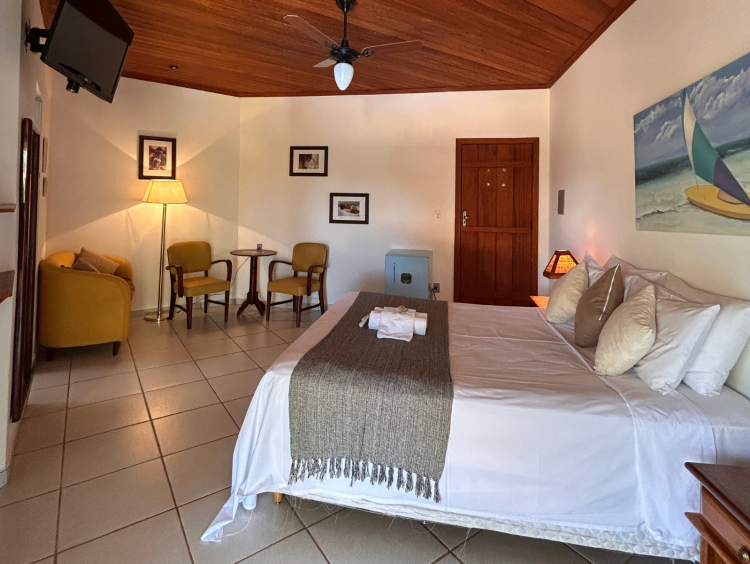 Aconchegante canto da suíte com duas confortáveis cadeiras amarelas ao lado de uma pequena mesa redonda de madeira. Um frigobar azul complementa o espaço, trazendo praticidade. Um abajur em estilo rústico se destaca sobre um criado-mudo de madeira, adicionando charme à decoração.