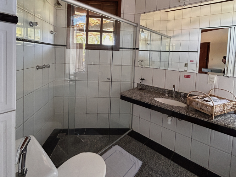 Esta é a elegante área de banheiro da Suíte Master. O ambiente apresenta um espaçoso box de vidro com detalhe de granito no piso e uma pia de mármore bem equipada. Os acabamentos são modernos, com itens de cortesia ao lado da pia. Um toque de sofisticação para uma estadia confortável.