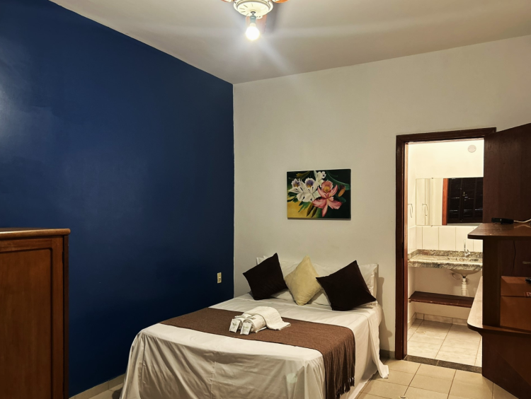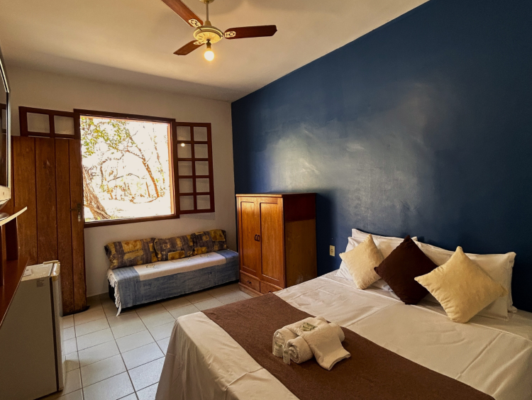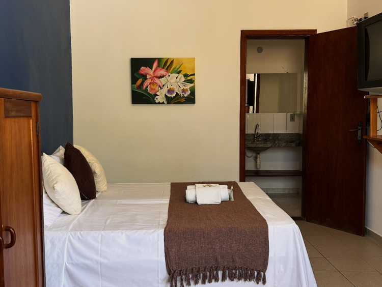 Esta acomodação é a nossa mais econômica. Se encontra no primeiro andar da pousada, possui cama box, tv de LED, ventilador de teto, frigobar e banheiro privativo. Acesso e janelas com vista para o estacionamento. Para hospedagem de apenas uma pessoa, sugerimos entrar em contato conosco.